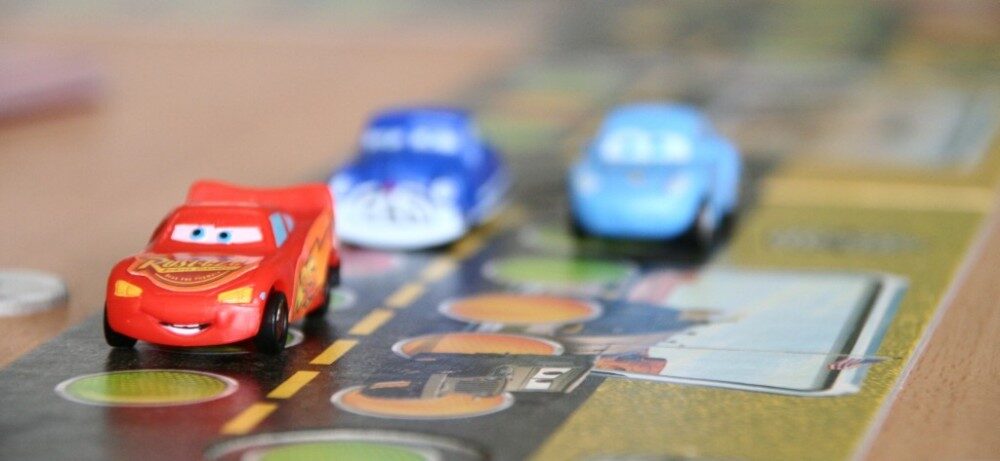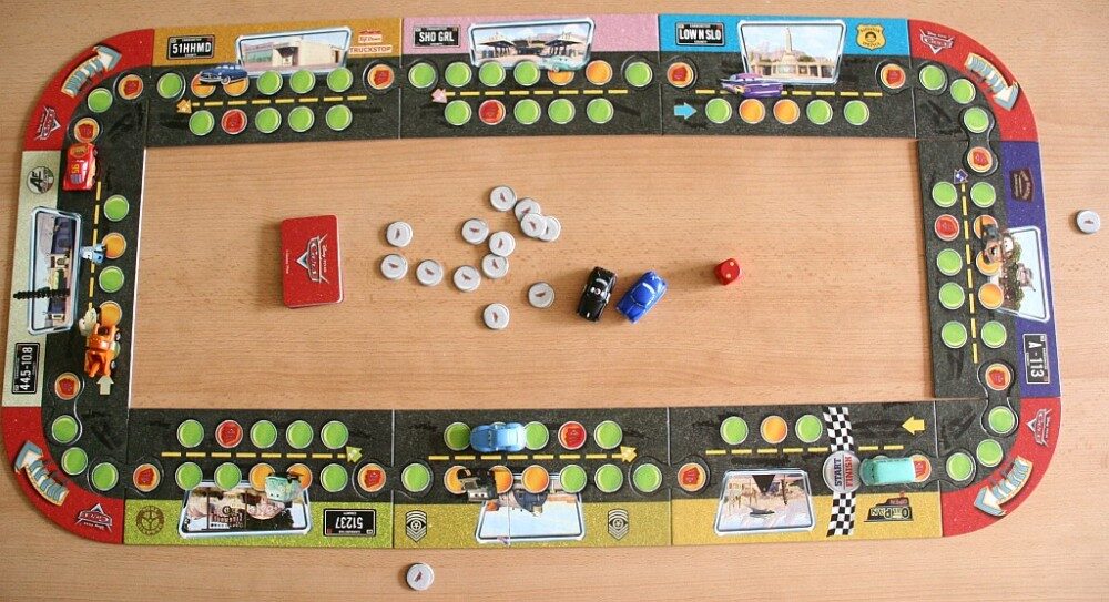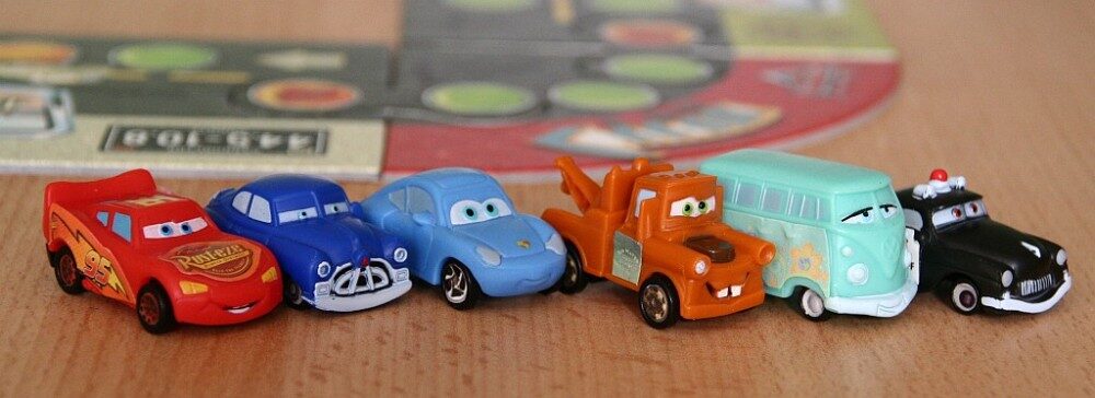 „Tak já poskládám trať. Jakou chceš hrát? Krátkou, střední nebo dlouhou? Jé, tak tam dáme určitě Lujdžího…,“ nevydržel už klučina poslouchat sestřičku a nepřipouštěl si vůbec možnost, že by si tatínek mohl vybrat něco jiného než auta. Jeho povídání se vytratilo do slabého šepotu, jak se soustředil na skládání trati z dílků. Hra totiž obsahuje kromě čtyř zatáčkových dílů osm rovinek, které mohou být libovolně uspořádány. Každá z nich patří některé z filmových postav, které pak na některých částech plánu ovlivňují dění na trati (bonifikacemi či penalizacemi).