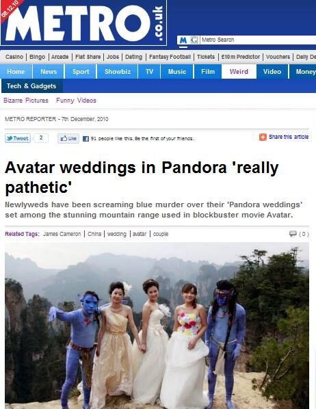 Organizátoři pandorských svateb zkrátka přišli na snadný způsob, jak vydělat na obrovském úspěchu zmiňovaného snímku. Vše se odvíjí od skutečnosti, že se režisér James Cameron při vizualizaci vznášejících se hor inspiroval právě krásou skalnatého horského štítu v oblasti Wulinyuan na jihu Číny.
