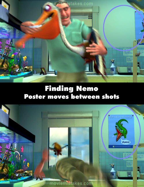 3. Když Marlin těsně po únosu hledá Nema na hladině oceánu, musí se po chvíli vrátit zpátky pod vodu, aby se nadechl. Ale ve scéně, kdy Dory a Marlina chytí vodní ptáci, oba bez problému dýchají vzduch nad hladinou.