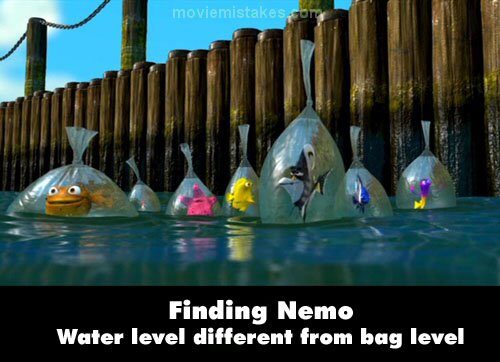 8. Žádný z Pixarovských animátorů si zřejmě nikdy nekupoval rybičku. Ve scéně, kdy všechny rybky prchající ze zajetí, naskáčou do moře, sáčky naplněné vodou plavou nad hladinou. Ve skutečnosti by obě hladiny, tedy ta v sáčku i v oceánu, měly být ve stejné úrovni a rybičky by se ocitnuly pod vodou.
