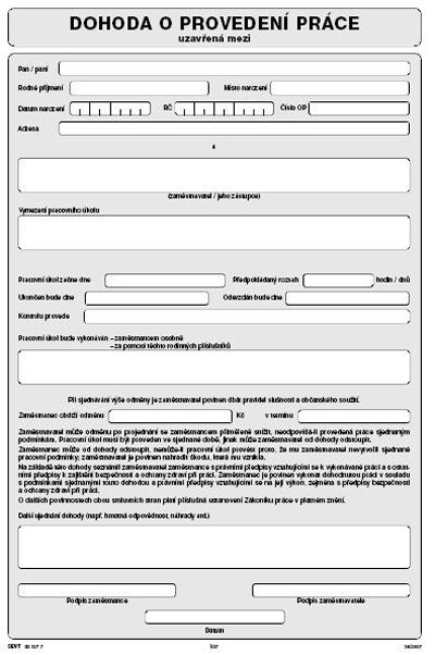 Pokud s vámi bude chtít zaměstnavatel uzavřít smlouvu písemně, měli byste se setkat se vzorem na předchozím obrázku. Na počátku celého jednání by mělo být jasně stanoveno, jaký pracovní úkon budete vykonávat, dále jaká bude odměna za jeho provedení a rovněž doba, v níž má být pracovní úkol proveden. Z hlediska smlouvy je samozřejmě lepší forma písemná, kde máte vše černé na bílém a nemusíte se spoléhat jen na váš instinkt, že nebudete ústní formou podvedeni. Takovýto podvod by patrně byl právně napadnutelný. Nemyslím si však, že byste s něčím takovým chtěli trávit čas.