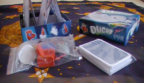 Nuže, podívejme se hře na zoubek. Ale vlastně, na jaký zoubek? Blbost, ten v Duchovi těžko někdo najde. Jako náhradu však lze zvolit samotného ducha, myš, křeslo, knihu nebo láhev. Co to má znamenat? Přeci hlavní komponenty hry. Člověk by řekl, že v karetní hře o nějakých dalších částech nemůže být řeč. Duch! ale není jen tak ledajaká hra. Karty zde jdou ruku v ruce s pěti zmíněnými předměty a jedno bez druhého se neobejde.