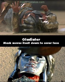 6. Když Maximus bojuje s gladiátorem Tigridem, Tigris upadne na zem a můžeme vidět, že jeho maska je zcela jasně otevřená. Po střihu má ale masku opět staženou a Maximus mu ji sundává – zřejmě na efekt. Sami se můžete podívat: