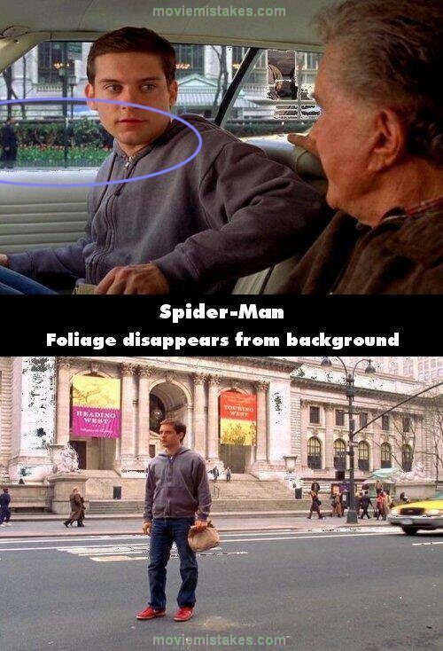 1. Když Peter trénuje střelbu pavučinou, tak rozbije sklo na rodinné fotografii. Jenže hnedle v dalším záběru je sklo v pořádku a fotografie pouze leží jinde.