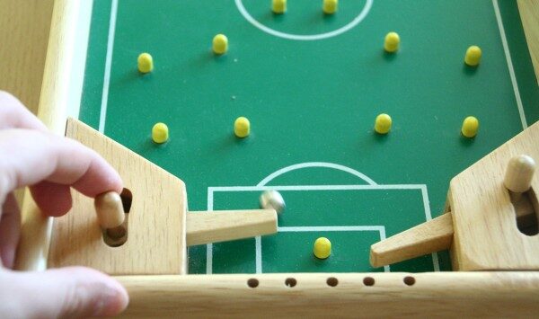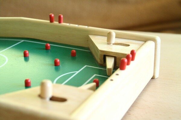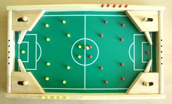 Ve firmě Olymptoy si řekli, že by možná nebyl špatný nápad spojit tento jednoduchý páčkový princip s bodováním a vytvořit tak jednoduchou hru pro dva hráče. Na každé straně hrací desky by byla branka bráněná dvěma páčkami. Když tento prototyp vyrobili, zjistili, že se kuličky často zastavují někde na hřišti mimo dosah hráčů a hlavně páček. Proto se rozhodli protější poloviny plánu naklonit proti sobě ve tvaru písmene A a vytvořili tak nakloněnou rovinu.