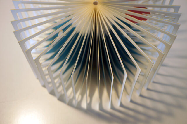 Japonský umělec si připraví jednotlivé pláty – listy knihy, kterou pak složí do podoby vějíře. Ten lze rozevřít na 360 stupňů, což umožňuje, aby jeho knihy byly zkoumány z více úhlů pohledu. Každý úhel poodhalí jiné detaily Oonovy mistrně provedené práce.