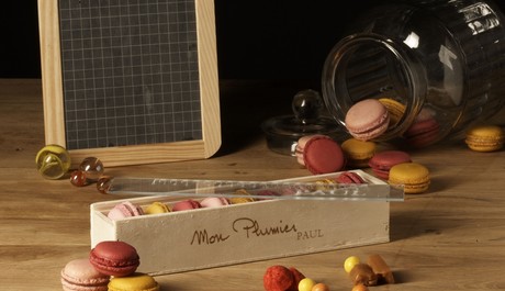V podzimní nabídce najdete originální mini makronky „Back to school“ v praktické dřevěné krabičce s pravítkem pro školačky i školáky. Dřevěný obal se po snědení křupavých pusinek z bílků, mandlí a cukru může stát nápaditým dětským penálem.