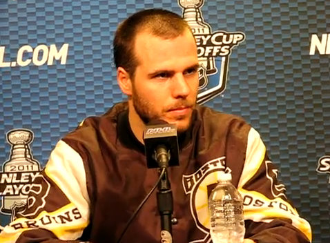 Hokejista David Krejčí na tiskové konferenci po jednom z finálových zápasů o Stanley Cup v sezoně 2010/2011 Zdroj: youtube.com