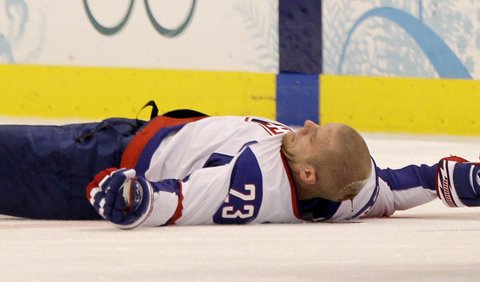 Ľubomír Bartečko leží bezvládně po souboji s norským obráncem na OH ve Vancouveru Zdroj: sport.cas.sk