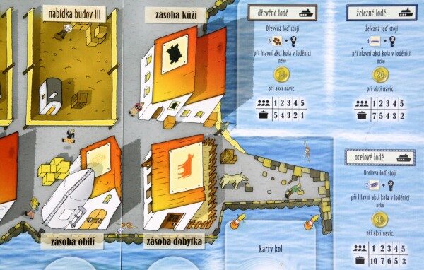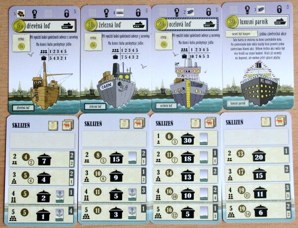 Po každém kole otočí hráči kartu kola, na jejímž rubu se nachází jedna loď, kterou si některý z hráčů v průběhu svého tahu může koupit. Začíná se s lodí dřevěnou, následuje železná a ocelová a na konci na vás čekají luxusní parníky. Než bude možné nějakou loď vypustit na vodu, musí mít jeden z hráčů postavenou loděnici (příp. její modernizaci pro stavbu lepších lodí). Poté je možné využívat lodí k převážení surovin a dostávat za jejich odvoz peníze. Další výhodou lodi, kterou oceníte zejména ve vyšších kolech, je snižování počtu potřebných jídel na konci kola (viz níže). Na každé kartě kola je na líci uvedeno množství jídla, které hráč zaplatí, pokud město staví budovu, nebo jestli probíhá sklizeň (množí se zvířata, násobí se obilí).