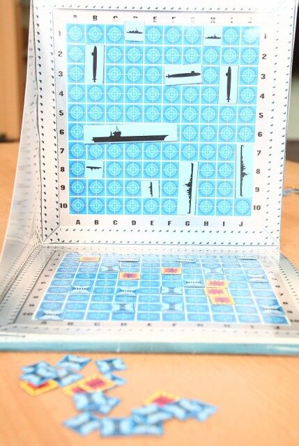 Hrací deska má tvar dvou písmen “L” obrácených k sobě zády. Na vertikální část rozmístí hráč svoje lodě, v horizontální ploše zaznamenává svoje úspěchy a neúspěchy ve střelbě na nepřátelské loďstvo. V příručce je sice naznačeno opačné rozestavení, ale nám přišlo při hraní intuitivní naopak toto rozložení.