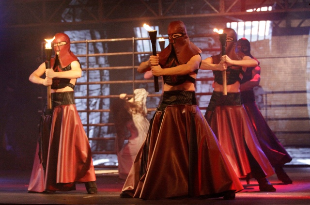 Oproti tomu například scéna s upálením Dorotky byla provedena do nejmenšího detailu. Choreografie tanečníků s rudými pruhy látky navíc podtrhovala efekt plamenů promítaný pomocí animací. Zde bylo vsazeno pouze na jednu barvu slaďující světelné efekty – rudou – a scéna tak působila opravdu démonicky a impozantně.
