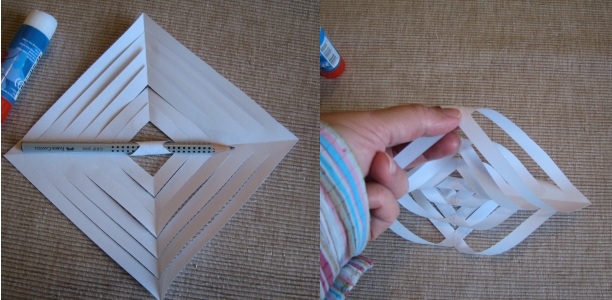 Pak si papír rozložte a vezměte si na pomoc tužku, pomocí které stočte jednotlivé proužky a spojte je lepidlem k sobě. Vždy lepte dva proužky nahoře a dva proužky vespod. Takhle pokračujte, dokud nebudete mít slepené všechny.