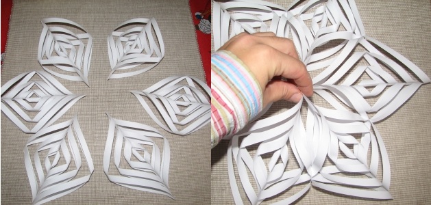 Vznikne vám krásná spirála, která představuje jednu část hvězdy. Takových spirál si stejným způsobem připravte šest. Když jsou hotové, slepte k sobě jejich kraje. Nakonec zalepte i středy a hvězda je hotová.