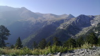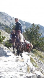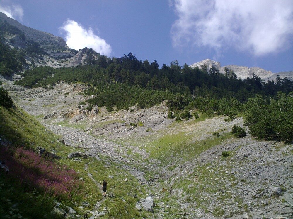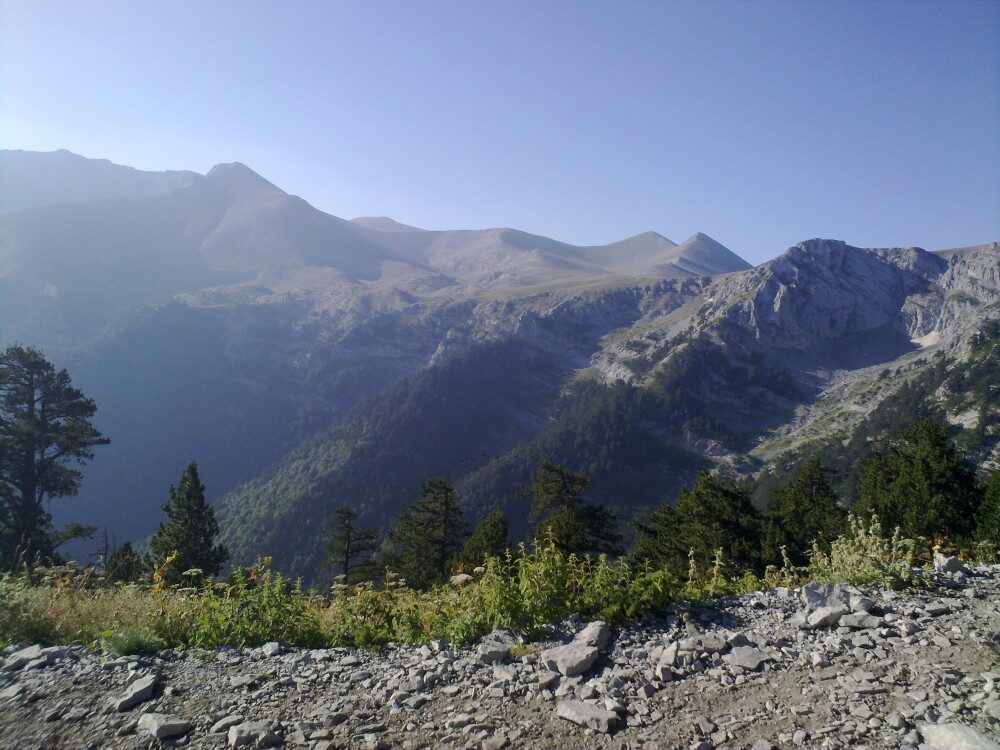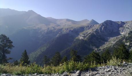 Měli jsme štěstí. Po pár minutách stopování, zastavil trochu hippiesácký wagen. A to doslova. Dva mladí kluci z Vídně Richard a Robert prý přijeli do Řecka na svatbu své sestřenice. Bálkán projeli rychlej než mysleli, tak teď jezdí sem a tam. Nakonec nás nejen, že dovezli do výstupního bodu do Prionie (1100 m. n. m.), ale v sándálech s námi vyšlápli na Refuge A do výšky 2100 metrů. Cesta to byla dlouhá. Slunce peklo a všem nám doslova tekly čůrky potu po zádech. Čím výš jsme po klikaté stezce stoupali, tím krásnější výhled se nám otevíral. Staré borovice postupňě přecházely v nízké dřeviny a barevné horské kvítí. Někde v dálce cinkaly muly, které nosí zásoby na jinak nepřístupné chaty.