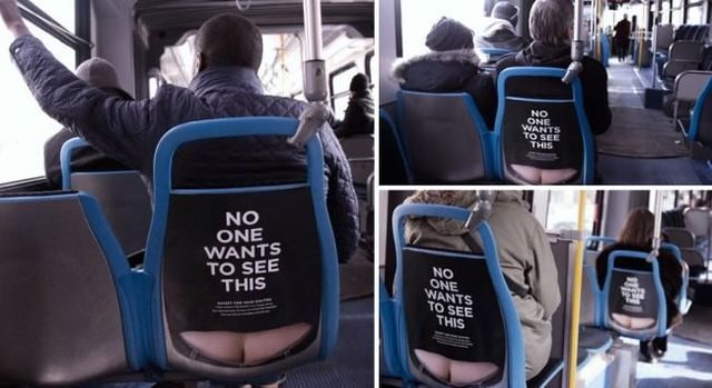 Následující situaci zná z městské hromadné dopravy asi každý z nás. Lidé nosící bokové džíny se posadí na plastovou sedačku a celému světu odhalí část svého pozadí. Této úsměvné situace využila společnost bojující proti rakovině a vymyslela poutavou reklamní kampaň.