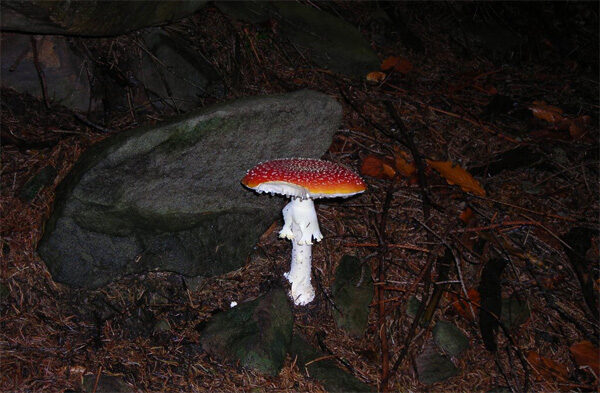Známá jedovatá houba, která obsahuje muskarin, kyselinu iboteinovou a muscimol. Využívá se k čarodějným obřadům a výrobě létajících mastí. Látky v ní obsažené způsobují barevné vize, navozují pocit euforie a létání. Podobné účinky mají také Muchomůrka královská, Muchomůrka tygrovaná a Helmovka ředkvičková, které obsahují muskarin a mykoatropin.