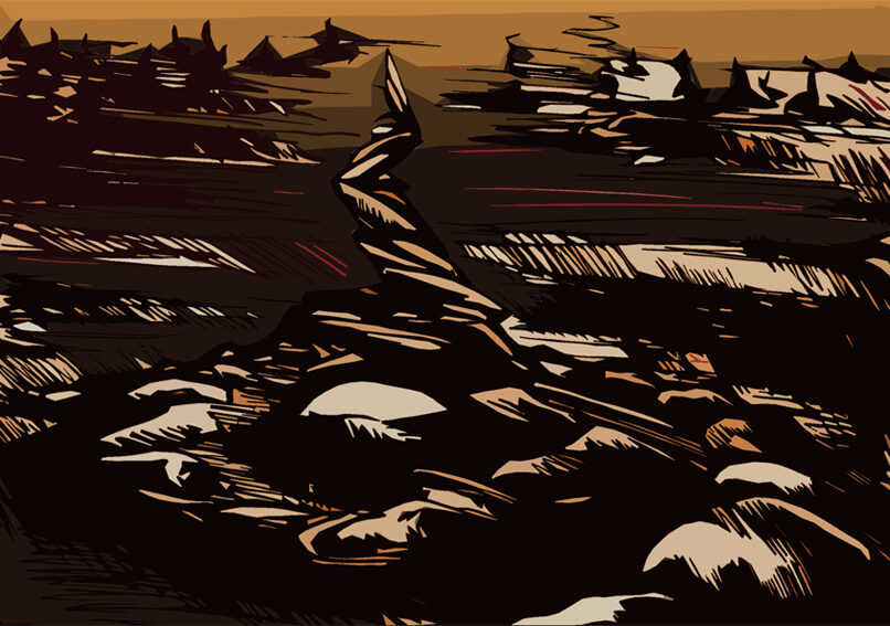 V květnu, když opět přivedla ovce churro na Horu Joea-Johna, úlomky ztroskotané lodi už dávno erodovaly, byly malé a s jemnými okraji jako kousky mořských kamenů, které najdete na pláži, a jí došlo, že takhle byly nejspíš i zkonstruovány: rozpadnout se na kousíčky tak malé, že si jich stěží někdo povšimne, a pak se rychle rozptýlit. Ale kameny, které navršila na tělo, vypadaly jako základ něčeho, a tak se pustila do pomalého vršení je na sebe do podoby pastýřské mohyly. Také sesbírala všechny jemné kousky erodovaného křídla a rozložila je v rozšiřujících se kruzích kolem základny mohyly. Pokračovala v hromadění kamenů po celé léto až do září, kdy pahorek dosahoval výšky patnácti stop. Rána, kdy zůstávala s ovcemi na míle daleko, jej hledala dalekohledem a přemýšlela o způsobech, jak jej ještě navýšit, a uvažovala, co je asi pohřbeno pod těmi ostatními pastýřskými mohylami, které tu v krajině vystavěli. V noci pozorovala oblohu, ale nikdo si pro něj nepřišel.