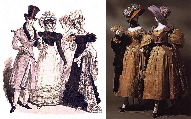 Ženskost podtrhoval upnutý živůtek, jehož dekolt odhaloval i části ramen. Vosímu pasu ženy napomáhaly i opticky, pokud se jim nepodařilo dostatečně zdeformovat žebra a vnitřnosti korzetem, pomocí zvětšených širokých rukávů. Ty leckdy dosahovaly opravdu úctyhodné šíře s bohatým řasením, a aby si zachovaly svůj nadýchaný tvar, používaly se všité kostice či různé výztuhy. Naducaným rukávům se tak podařilo ze šatníku vytlačit kabát. Za chladných dnů si přes šaty ženy přehodily šátek či šálu. V zimě kabáty zastoupily plášťové šaty ze silných vlněných látek, upnutých až ke krku. Přes ně se oblékaly široké pláštěnky bez rukávů, tzv. mantily. Jejich okraje zdobily bohaté výšivky či kožešinové lemy.