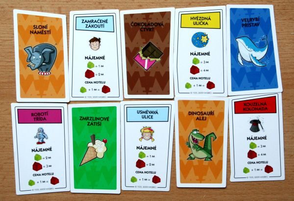 Na kartičkách jsou všechna čísla velmi přehledně rozmístěna, domečky mají odpovídající barvy a děti by neměly mít problém se v údajích zorientovat.  I v Bláznivých bankovkách jsou pozemky seskupeny do barevných skupin vždy po dvou. Vlastník obou stejně barevných lokalit má právo vybírat dvojnásobný nájem na každém z nich.