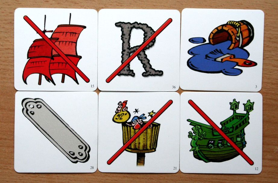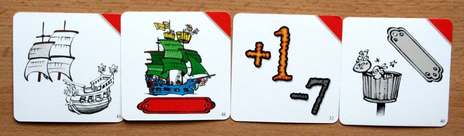 Samozřejmě nenajdete pouze kartičky zobrazující koš, plachty, trup nebo desku nápisu, ale také papouška nebo začáteční písmeno názvu lodi (od každého písmene jsou ve hře také dvě lodi). Specialitu tvoří karty s výjimkou, kdy se piráti na určeném plavidle nepřesouvají.