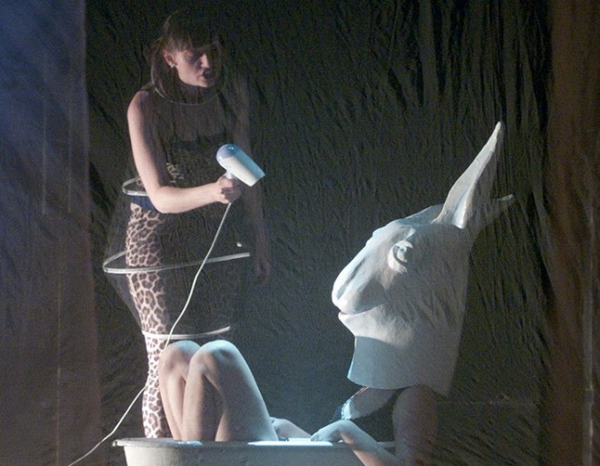 Ve vyšinuté grotesce nechybí samozřejmě bílý králík Zdroj: divadlodisk.cz