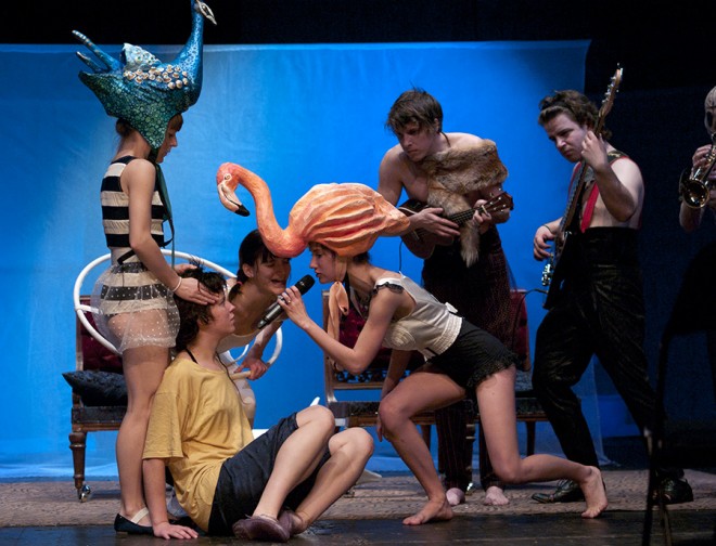 FOTO: Bílý králík v Disku.Po Divadle DISK běhá bílý králík a hraje cirkusová hudba. Režisérka Linda Dušková vyždímala ze třeťáků KALDu všechno, co mohli nabídnout. Zpěv, hudba, barevnost, tanec, masky a loutky – to vše najdete v perverzně vyšinuté grotesce Absint.
