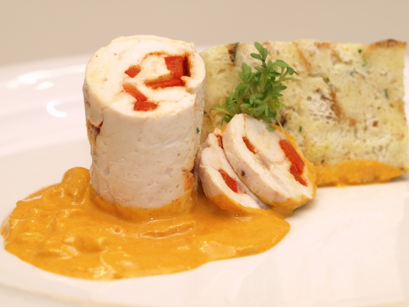 Z kuřete si vykrojíme zvlášť stehna a prsa. Stehna dáme uvařit do osolené vody a vaříme je, dokud nezměknou. Prsa si na fólii rozklepme na půlcentimetrové plátky, osolíme, opepříme a přidáme proužky nakrájené červené papriky a zabalíme do alobalu.
