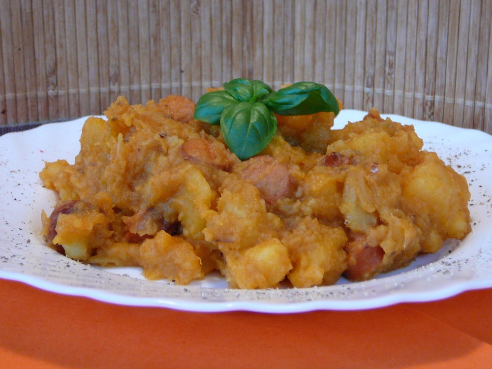 V hrnci rozpustíme máslo a orestujeme cibulku dozlatova. Mezitím oloupeme špekáčky a nakrájíme je na centimetrové plátky. Poté je vložíme k cibulce a opečeme.