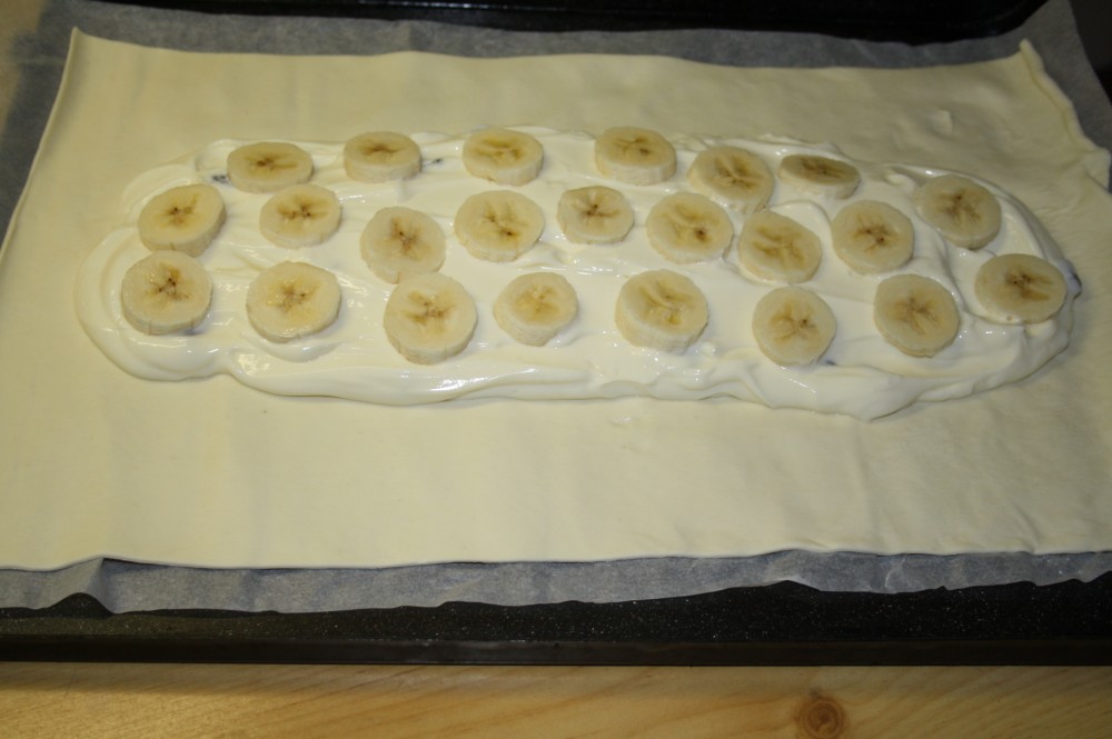 Náplň připravíme tak, že smícháme tvaroh, cukr, vanikový cukr, vanilkový dezert a rozinky. Směs důkladně promícháme a podle chuti můžeme ještě přisladit. Těsto rozvineme na plech a rovnoměrně naneseme směs doprostřed těsta po celé délce. Nakrájíme si banány na kolečka a poklademe je na tvavohový základ. Pak si rozklepneme do hrnku vejce, zamícháme a okraje těsta jím potřeme kolem dokola.