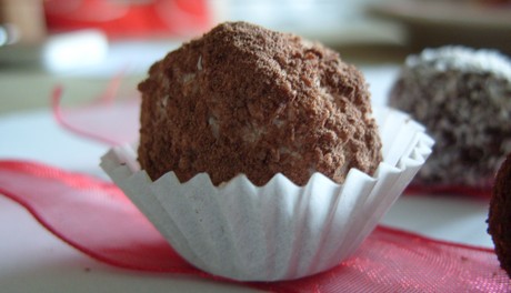 100 g lískových ořechů oddělíme a spolu s čokoládou rozmixujeme na moučku. Přidáme máslo, kakao a rum nebo rumové aroma. Vzniklou hmotu dáme ztuhnout do ledničky.