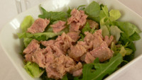 Vynecháme ale teplou kuchyni a rozhodneme se pro salát, ve kterém skvělá chuť tuňáka sashimi ještě více vynikne. Ledový nebo hlávkový salát natrháme do mísy, zakápneme ho olivovým olejem a lehce osolíme, přidáme nakrájenou papriku, rajče, okurku, popřípadě jiné suroviny dle individuální chuti, vše promícháme a necháme chvilku odležet. Mezitím si připravíme rybu. Tuňáka nakrájíme na větší hranolky, lehce osolíme a z každé strany krátce osmažíme (asi minutu) na pánvi. Tím se maso po povrchu zatáhne, ale uvnitř zůstane syrové. Poté maso vyjmeme z pánve a ostrým nožem lehce krájíme na plátky.
