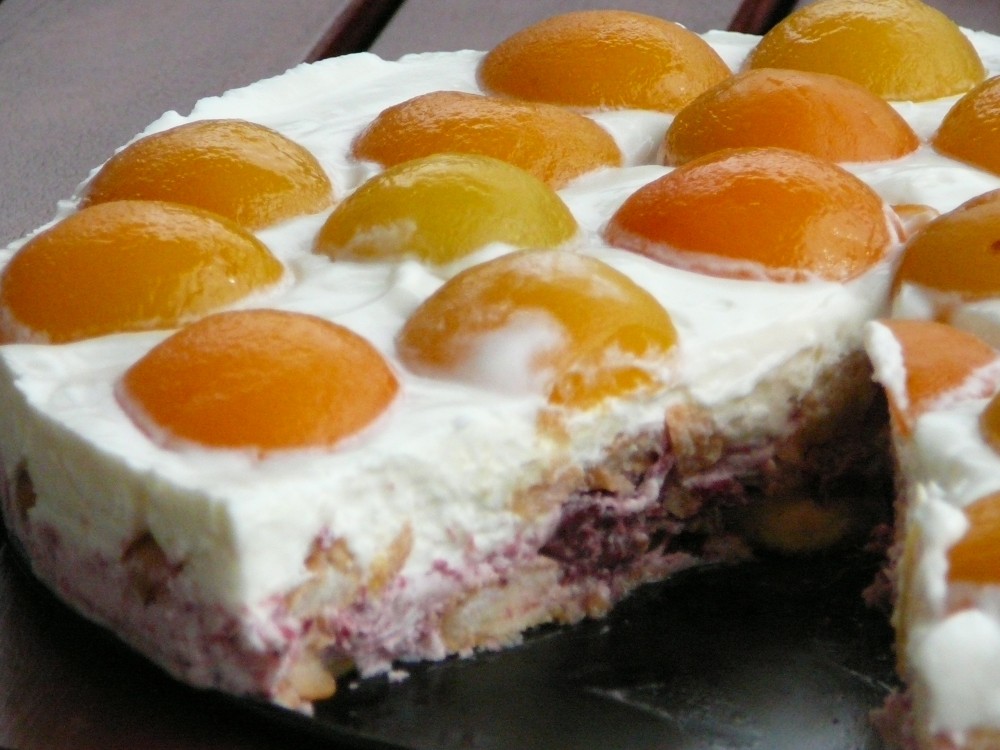 Povrch dortu nakonec potřeme bílým tvarohem a ozdobíme plátky broskví, které nám zbyly. Dezert vložíme do lednice a necháme cca dvě hodiny tuhnout. Poté vyndáme, nakrájíme a můžeme podávat.
