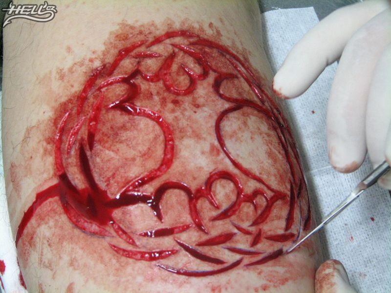 Další možností, jak vypálit jizvy, je pomocí kauteru. Kauter je tepelný skalpel, který za sebou ránu zatavuje a tím zamezuje krvácení. Čepelí kauteru lze na kůži ale i vypalovat podobně, jako by se na ni kreslilo tužkou, jen to víc bolí. Takto lze realizovat i motivy, které by bylo těžké či nemyslitelné po částech vyohýbat z plechu. Díky tomu, že kauter pálí (princip elektrického oblouku) jen v místě s kůží, lze lépe kontrolovat výslednou tloušťku a tvar jizvy.