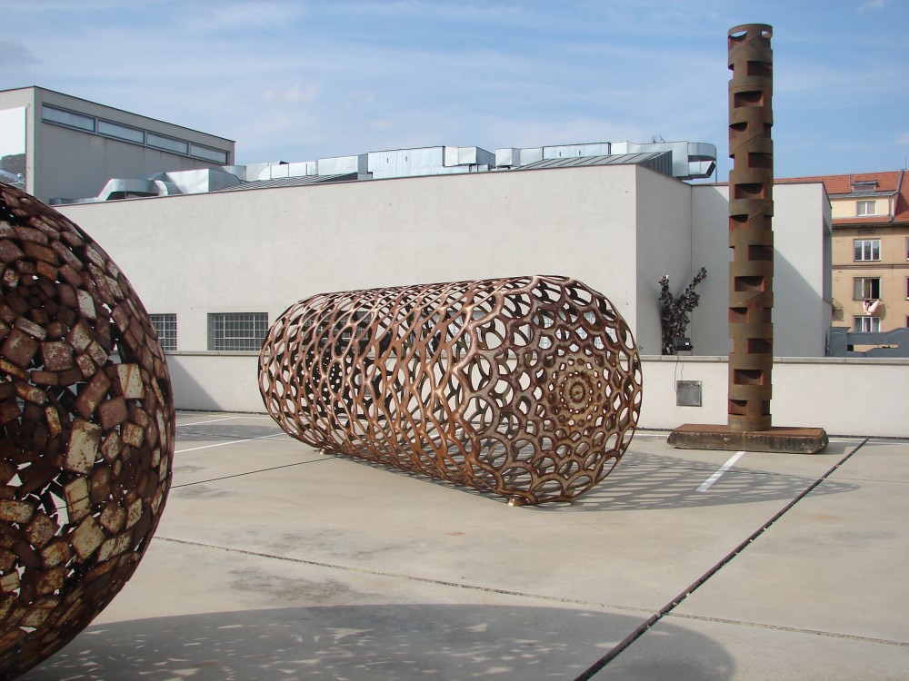 Tvoří krajky ze železných cisteren. Jsou vystavené na střeše DOXu