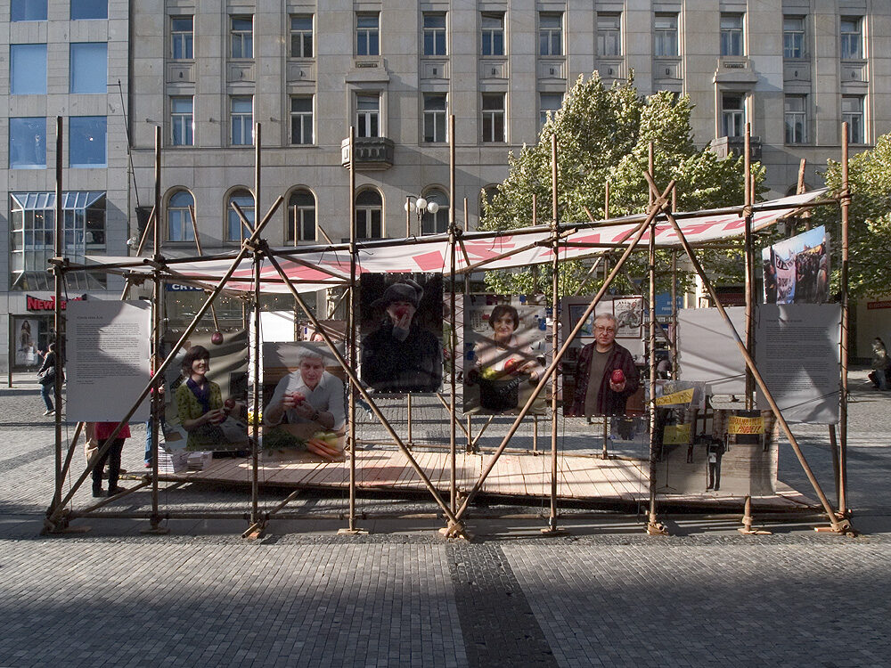 Průchozí pavilon z lešenářských trubek skrývá barevné fotografie českých renomovaných i začínajících vědců a vědkyň. Každý z portrétovaných drží v ruce plod ovoce či zeleniny vztahující se k položené otázce na poslání vědecké práce. Vědci na ulici vstupují nejen svými portréty. Několik fotografií dokumentuje také dosavadní činnost Fóra. To během uplynulého roku a půl zorganizovalo několik protestních akcí, během nichž čeští vědci poprvé opustili laboratoře a knihovny a v zájmu budoucnosti české vědy se vydali do ulic.