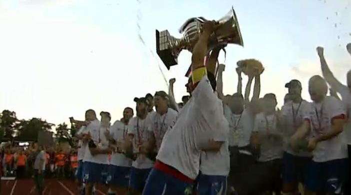 Kapitán Pavel Horváth zvedá nad hlavu pohár pro mistra ligy Zdroj: youtube.com