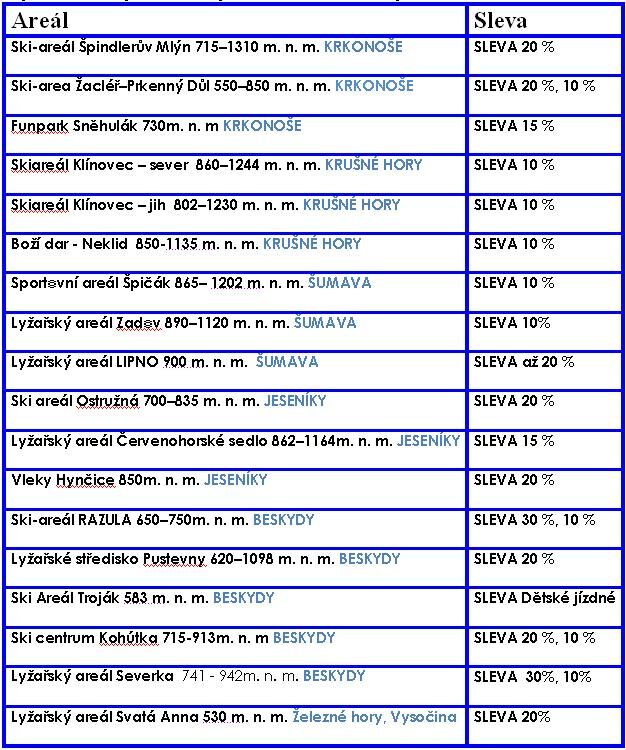 Jak už jsi majitelé těchto karet zvykli, hlavním lákadlem v tomto čase jsou samozřejmě slevy na skipasy v lyžařských střediscích po celé České republice. Ty se týkají lyžařských areálů v Krkonoších, Krušných horách, Jeseníkách, Beskydech, Železných horách a také na Šumavě a v průměru dosahují od 10 do 30 procent. Uvedená střediska jsou v tabulce.
